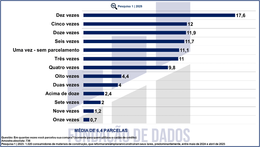 A maior incidência é de dez parcelas, com 17,6%, enquanto a média dessa amostra é de 6,4 parcelas.