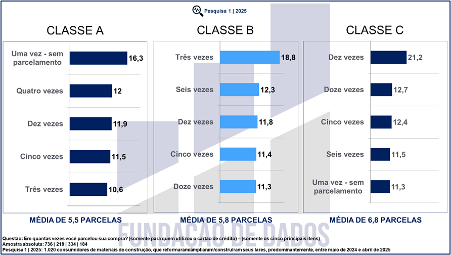 Já a maior incidência nos consumidores da classe B é de três vezes, com 18,8%, enquanto a média dessa amostra é de 5,8 parcelas.