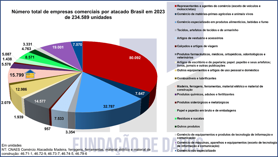 Segundo a pesquisa do Instituto Brasileiro de Geografia e Estatística (IBGE), em 2023, o Comércio por atacado e seus 19 agrupamentos totalizaram 234.589 empresas comerciais por atacado formalmente constituídas, sendo que, somente no Atacado de madeira, ferragens, ferramentas, material elétrico e material de construção foram 15.799 empresas.