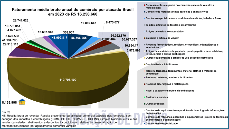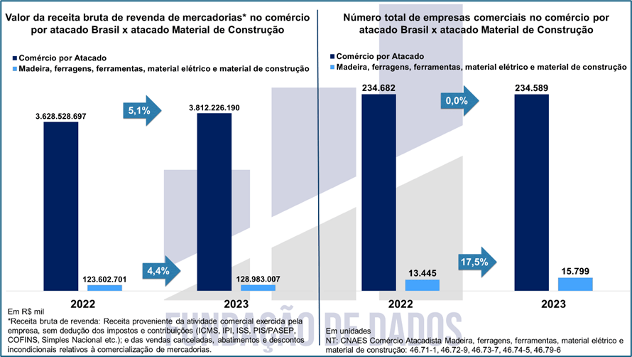 Na passagem de 2022 para 2023, o faturamento bruto anual do comércio por atacado brasileiro cresceu 5,1% (de R$ 3,6 trilhões para R$ 3,8 trilhões), enquanto o comércio por atacado de materiais de construção cresceu 4,4% (de R$ 123,6 bilhões para R$ 129 bilhões).