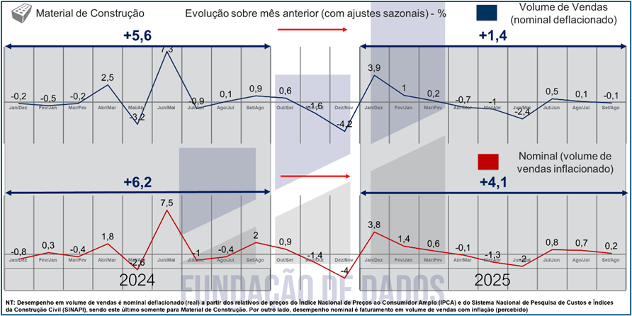 Por fim, em outra métrica da PMC, no comparativo acumulado ano setembro de 2025 com acumulado ano setembro de 2024, a atividade comercial Material de Construção cresceu 0,6% em volume de vendas e 3,2% nominalmente.