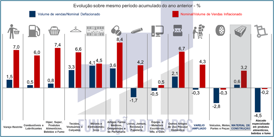 Dessa maneira, é certo que, ao final do ano vigente, o comércio de materiais de construção desacelerará, após crescer, no comparativo 2024 com 2023, 4,8% em volume de vendas e 4,9% nominalmente.