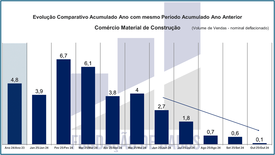Segundo a pesquisa do Instituto Brasileiro de Geografia e Estatística (IBGE), no comparativo do acumulado ano outubro de 2025 com o acumulado ano outubro de 2024, em volume de vendas (faturamento real/nominal deflacionado), houve crescimento de 0,1%.