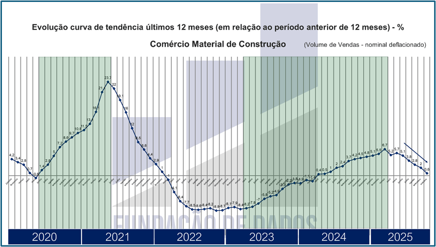 Por fim, na métrica mais adequada para análises de linhas de tendência – comparativo últimos 12 meses com os últimos 12 meses anteriores – o comércio de materiais de construção, em volume de vendas, desacelera também desde junho de 2025.