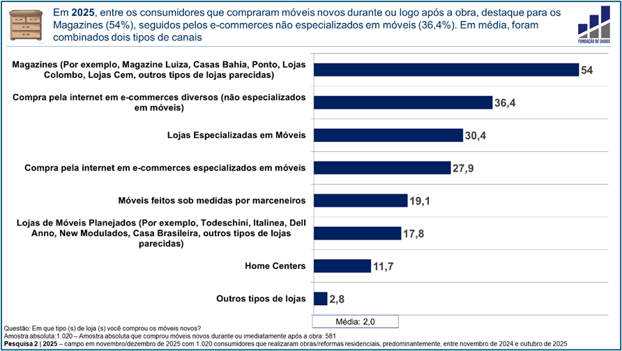 Então, perguntamos, na Pesquisa 2 | 2025 (detalhes técnicos no rodapé dos gráficos), aos consumidores que fizeram obras/reformas e compraram móveis novos durante ou logo após a obra: “Em que tipo de loja você comprou os móveis novos?”