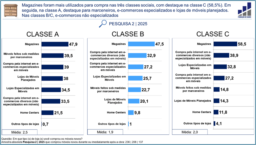 Já os e-commerces diversos (não especializados em móveis) foram o segundo canal, tanto na classe B (32,9%) quanto na classe C (38,9%).