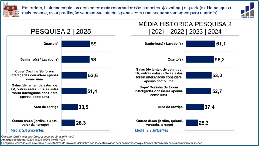 Na pesquisa mais recente (Pesquisa 2 | 2025), surgem os quartos minimamente assumindo o protagonismo com 59%, seguidos pelos banheiros/lavabos (58%).