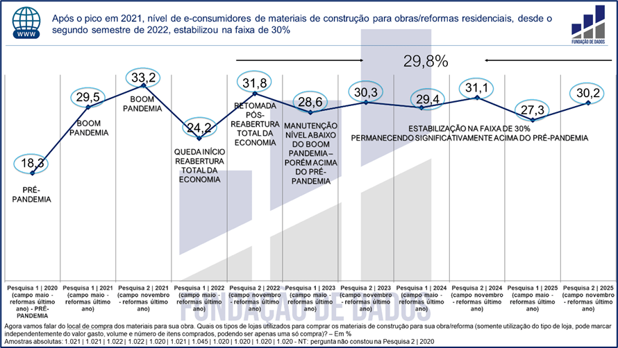 Na Pesquisa 1 | 2020, realizada em maio do respectivo ano com 1.021 consumidores que haviam feito obras e reformas no período anterior de 12 meses, 18,3% compraram ao menos um material de construção pela internet (detalhes técnicos no rodapé do gráfico).